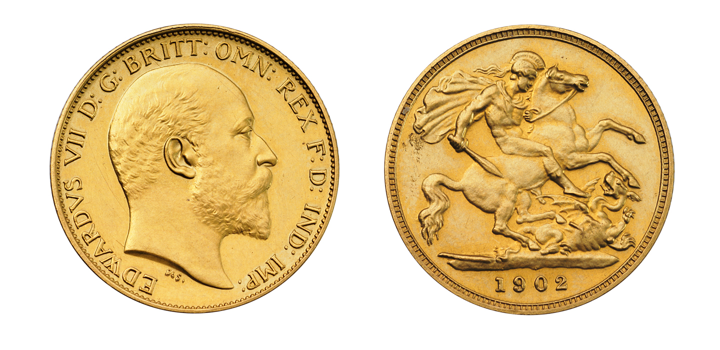 To begin with production of Sovereigns abroad was closely monitored but by 1871 Sydney was allowed to strike Sovereigns bearing the same design as those struck at Tower Hill, apart from small ‘S’ mintmark. Branch mints were set up in Melbourne (1872), Perth (1899), Ottowa (1908), Bombay (1918) and Pretoria (1923), all of them striking Sovereigns distinguishable from one another only by their individual mintmarks. From 1887 all of them carried the increasingly iconic St George and the dragon.